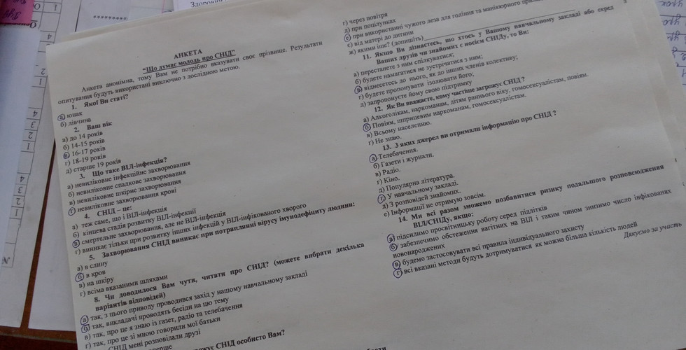 В кінці диспуту всі учні класу пройшли анонімне анкетування «Що думає молодь про СНІД». В результаті дослідження анкет було встановлено, що діти в повному обсязі засвоїли матеріал і знають, що здоровий спосіб життя – найкращі методи профілактики СНІДу.